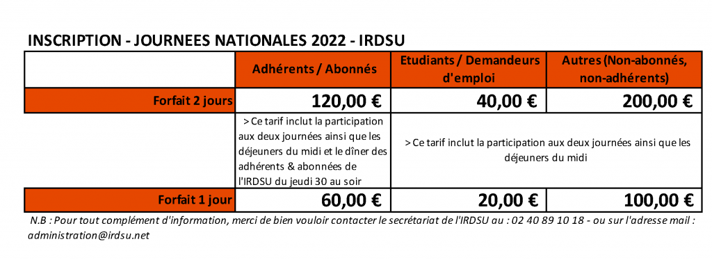 Retrouvez nous le 30 juin & 1er juillet pour les 17èmes Journées Nationales à Saint Denis dédiées à la jeunesse et la politique de la ville de demain Les inscriptions sont ouvertes ! Inscrivez-vous ici ! Retrouvez le programme ! Télécharger le programme Tarifs Pour toutes inscriptions groupées, contactez-nous ! administration@irdsu.net et/ou 02 80 89 10 18